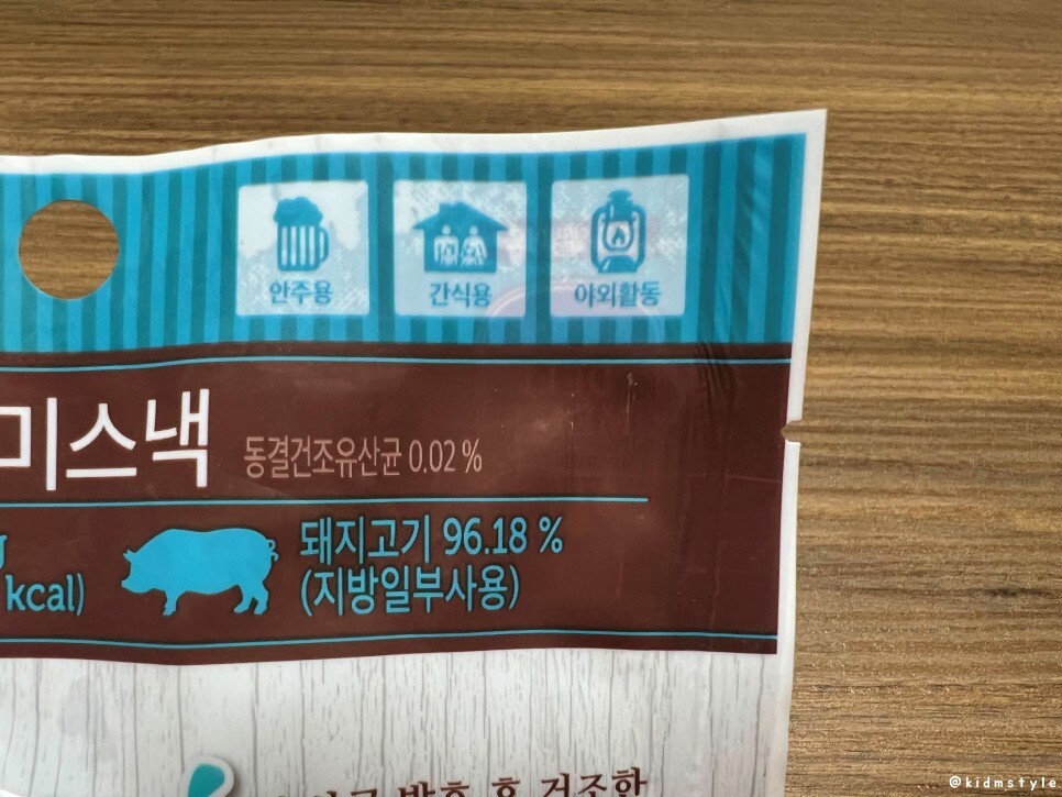 안주, 간식, 야외활동에 적합한 제품이다. 국산 돼지고기 96.18%의 함량이다. 물론 지방 일부 사용.
