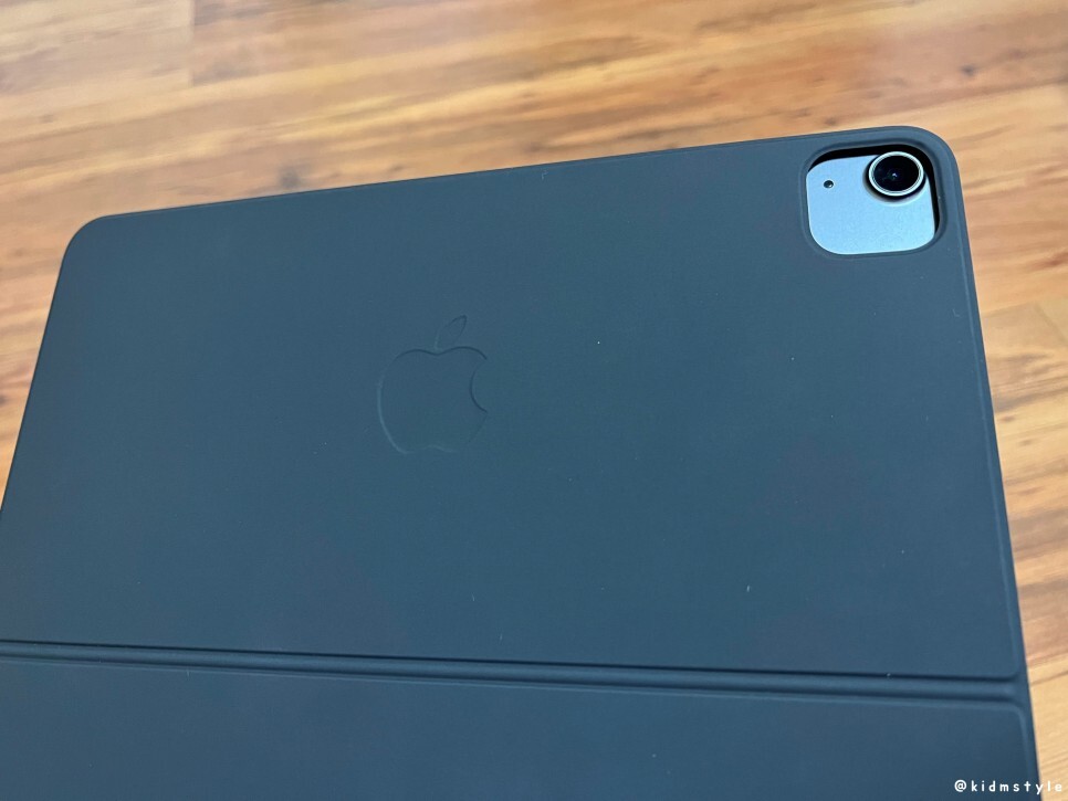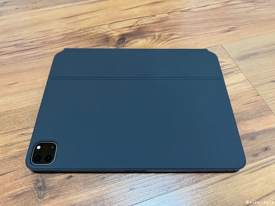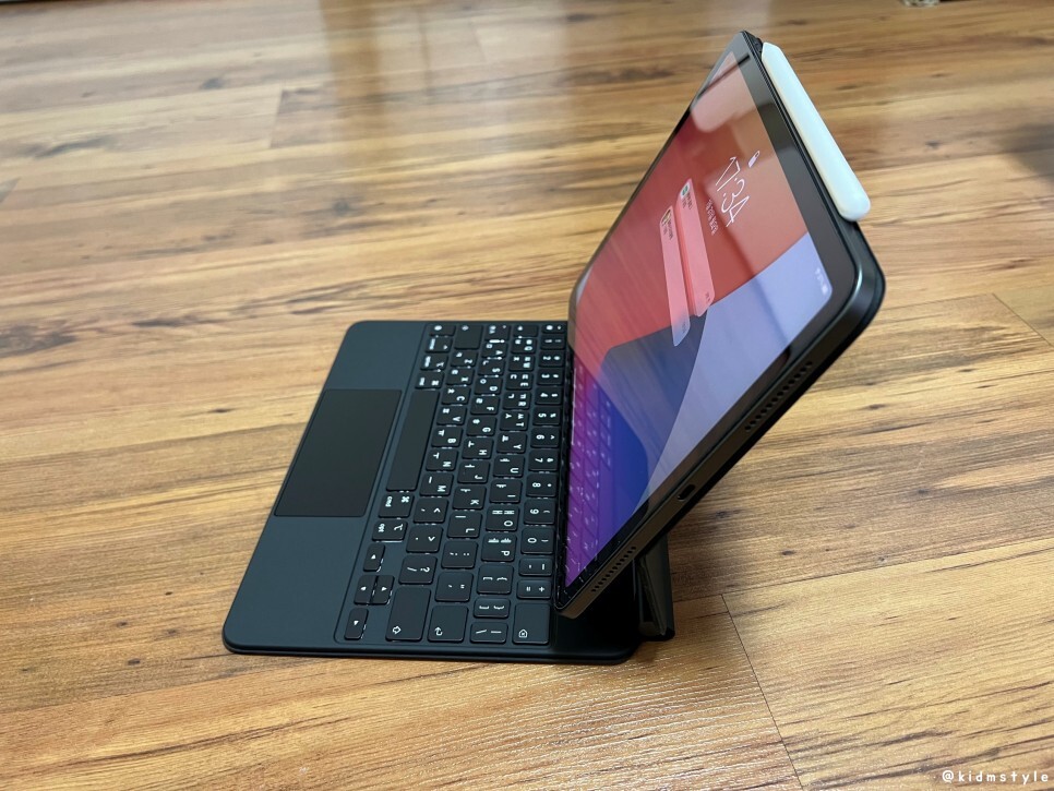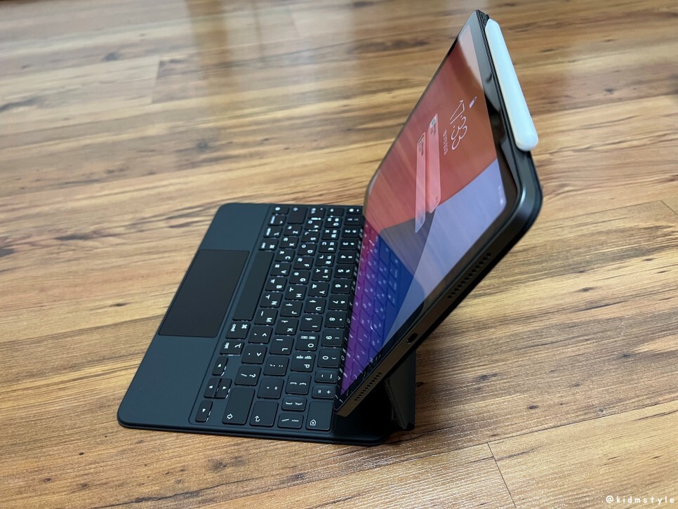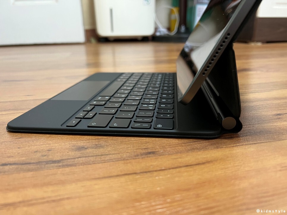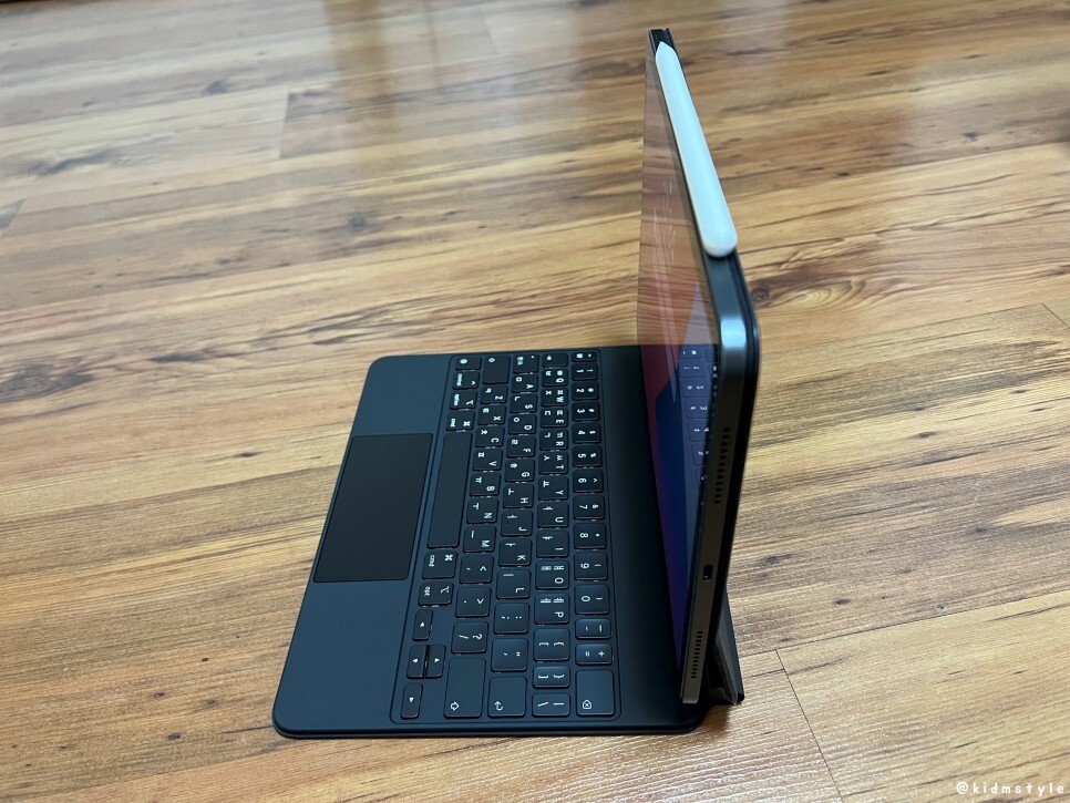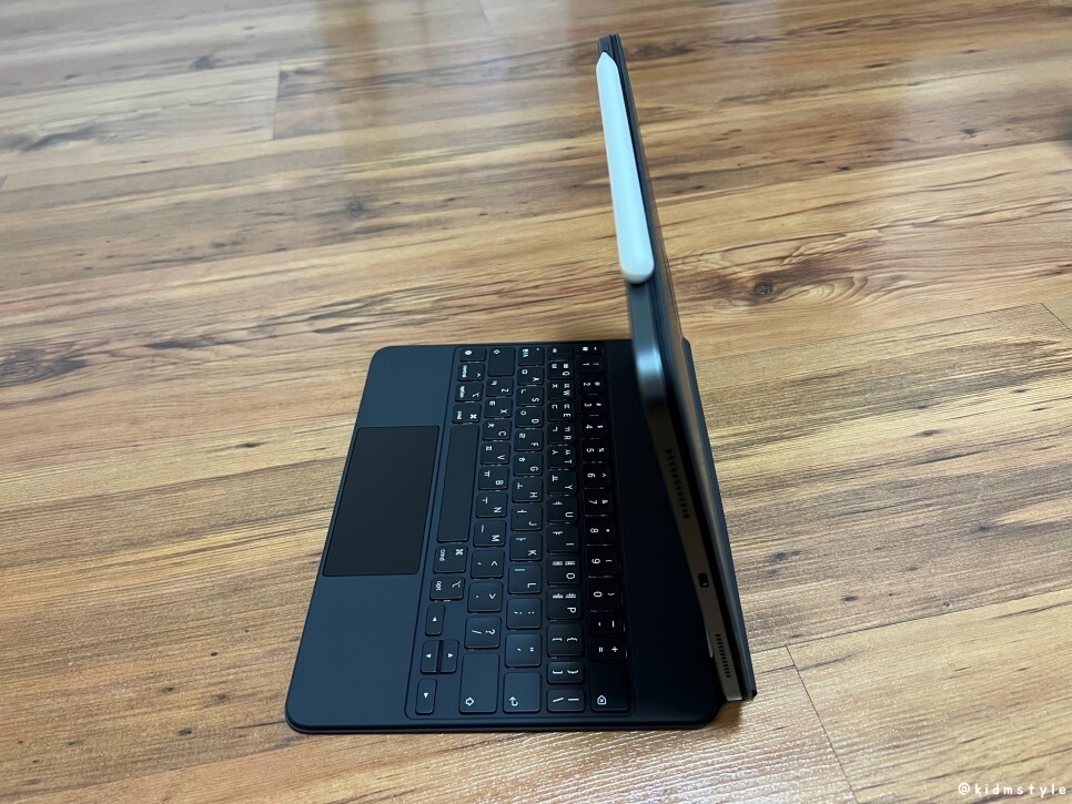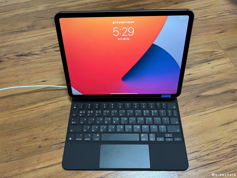 매직 키보드 하단에 케이블을 꽂아도 키보드를 사용할 때 간섭이 전혀 없다. 매직 키보드와 아이패드 프로의 일체감이 상당히 좋다. 노트북 같아 보이기도.