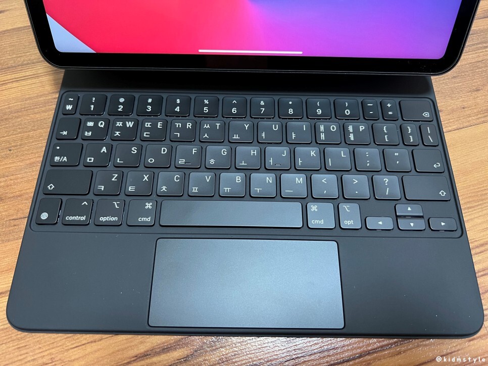 스마트 키보드 폴리오와 가장 큰 차이점이 키보드의 재질이다. 매직 키보드는 노트북처럼 플라스틱 키보드 재질이며 하단에 트랙패드가 달려있다. 그래서 사용하다 보면 화면에 터치할 일이 확실히 줄어든다.