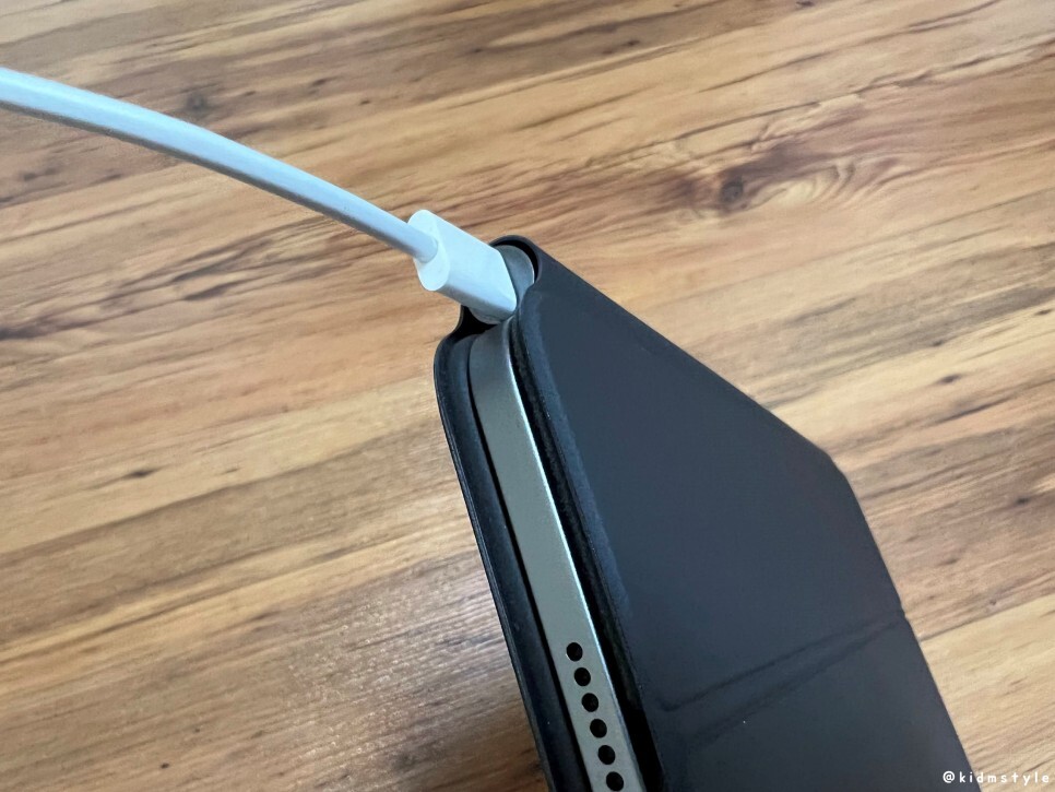 이쪽에는 포트가 없기 때문에 아이패드에 바로 충전 케이블을 꽂아도 된다.