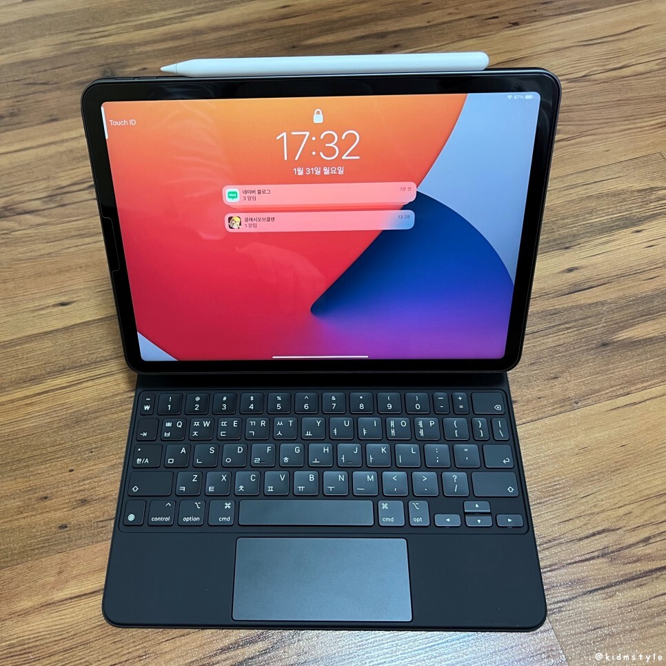 아이패드 에어 4세대에 매직 키보드를 장착한 모습이다.
