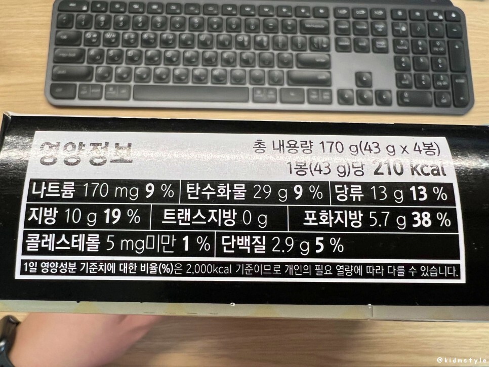 환경을 지키는 eco 패키지로 구성되어 있으며 4봉지가 들어가 있다. 170g에 총 840kcal이다.
