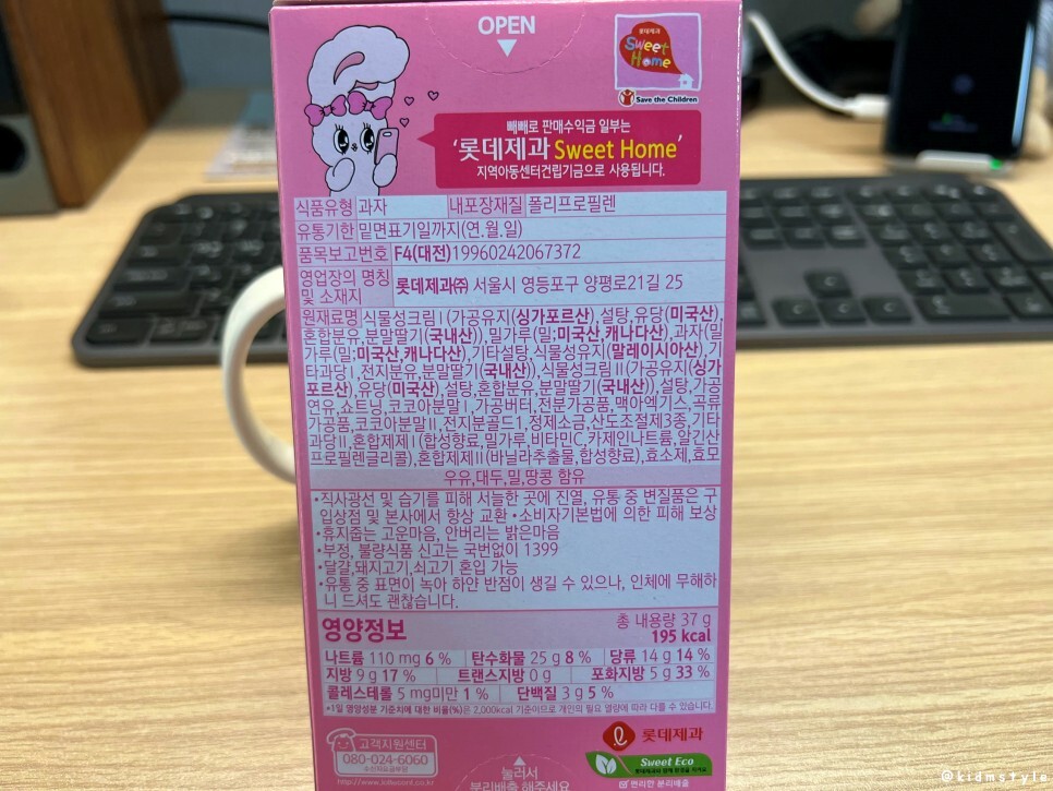 귀여운 포장이다. 핑크색에 아기자기한 캐릭터와 그림들이 봄과 참 잘 어울린다. 실제로 이 제품은 벚꽃이 한창 피던 시기에 판촉을 상당히 많이 하더라. 대형마트에서 한 통에 1,000원에 구입했다.