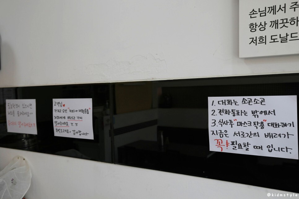 개인적으로 식당에 갔을 때 ~~하지 마라, 하지 마라 많이 적혀있으면 인상이 딱 찌푸려지는데 이 정도는 이해가 간다. 매장이 좁은 편이다. 그래서 손님들 간에 배려가 필요하다. 간혹 식당에 가면 목소리 큰 손님들이 있는데 진짜 너무 싫다.