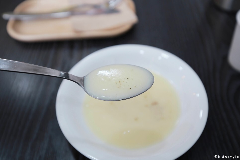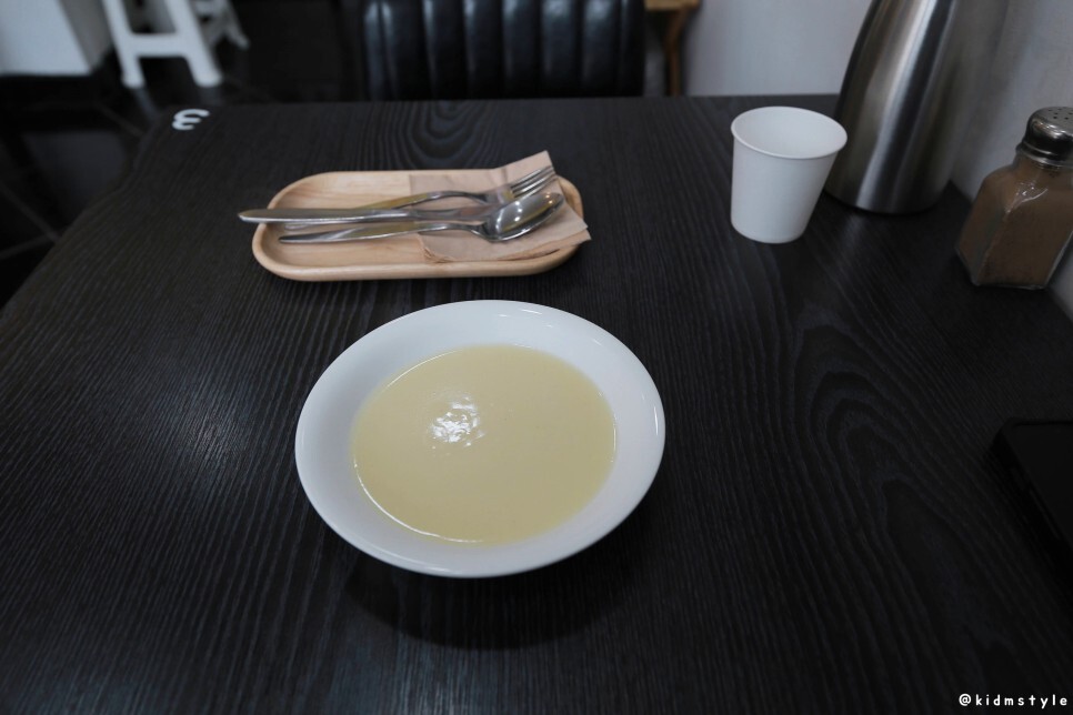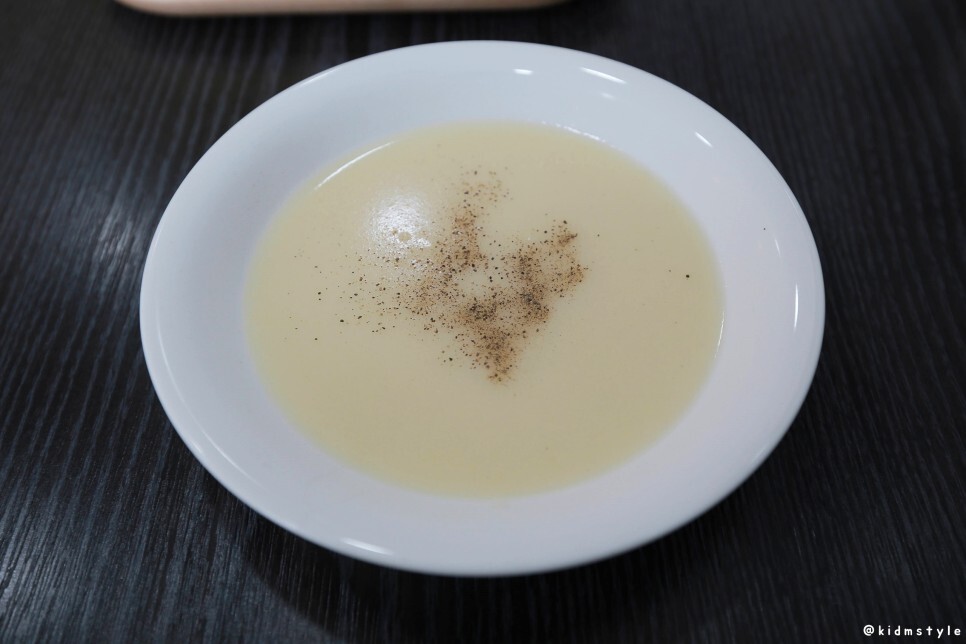 조금 기다리니 스프가 나온다. 수저와 칼도 따로 트레이에 담아서 나온다.