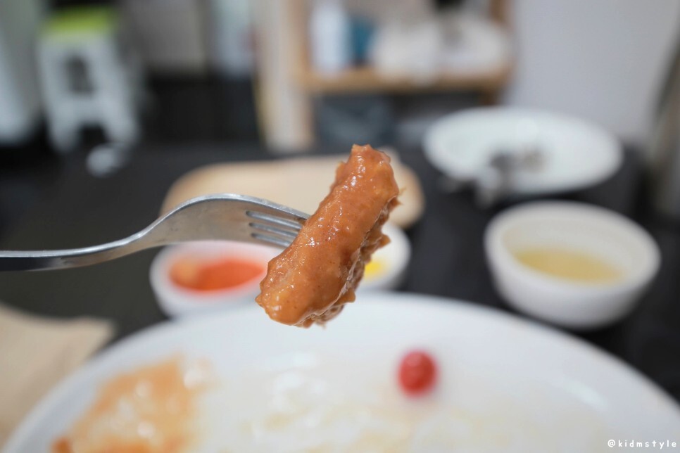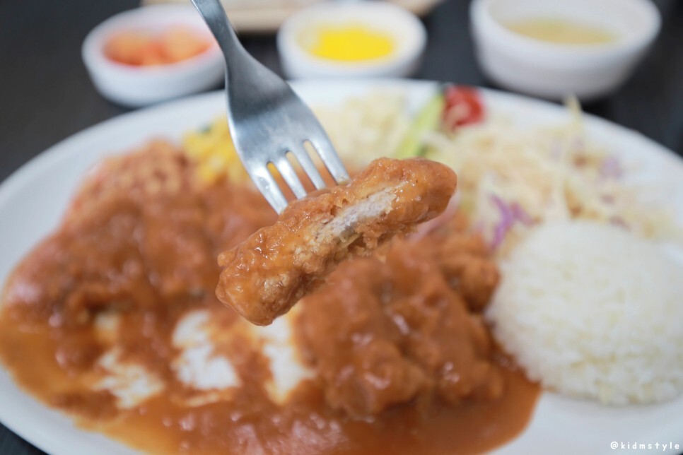 두께는 적당히 두꺼우며 고기의 연육 작용이 잘 된 것 같다. 튀김과 고기의 조화가 아주 좋다. 튀김옷이 따로 놀지 않아서 마음이 편하다.