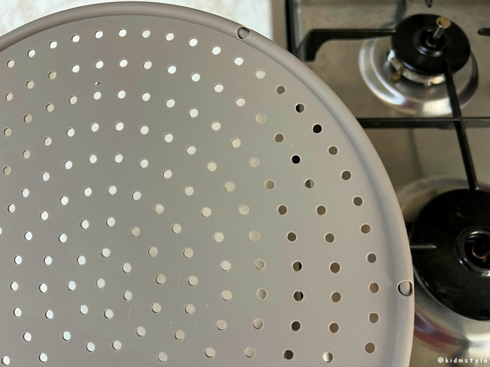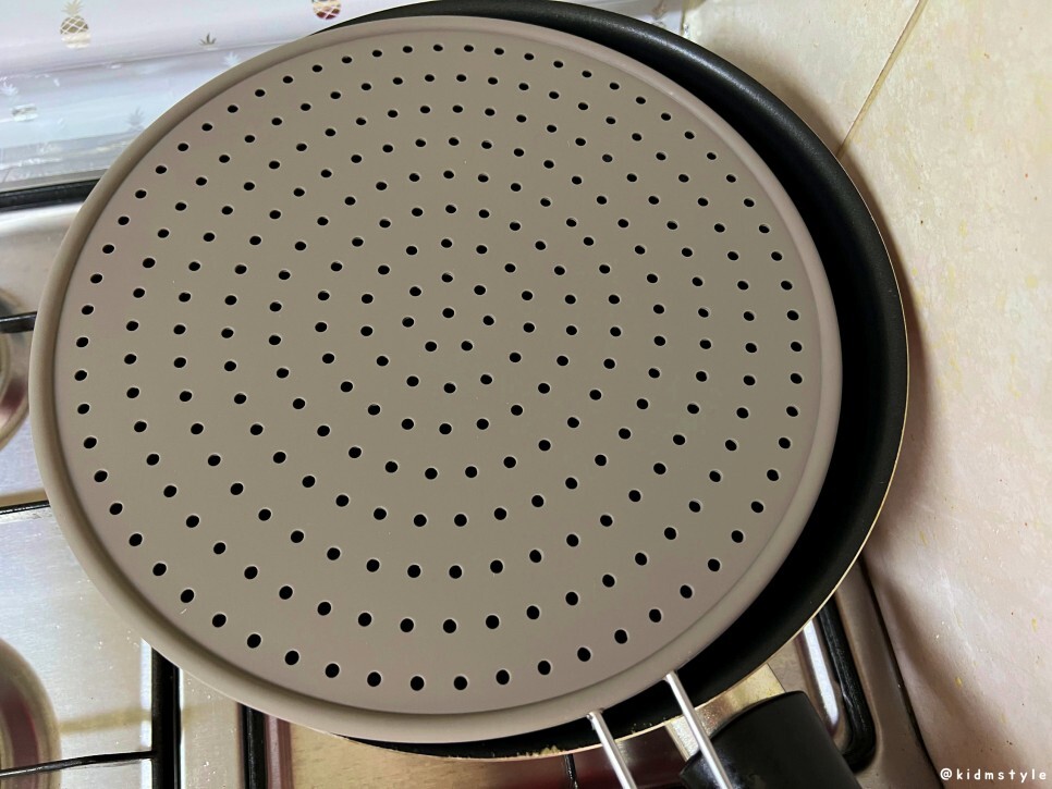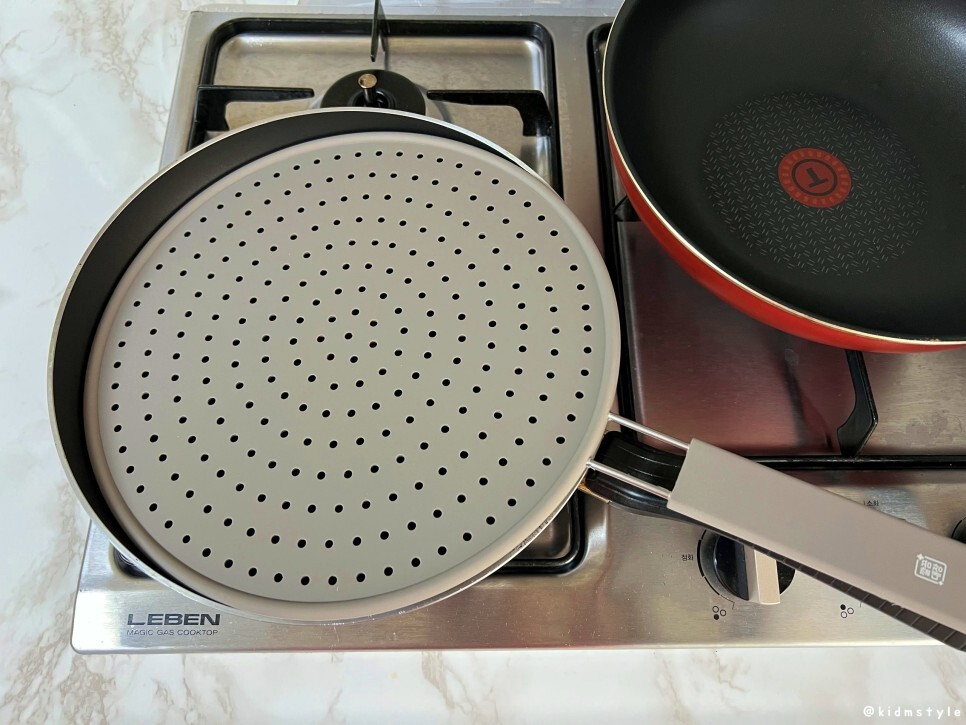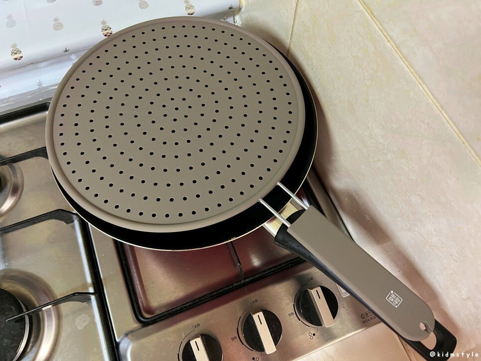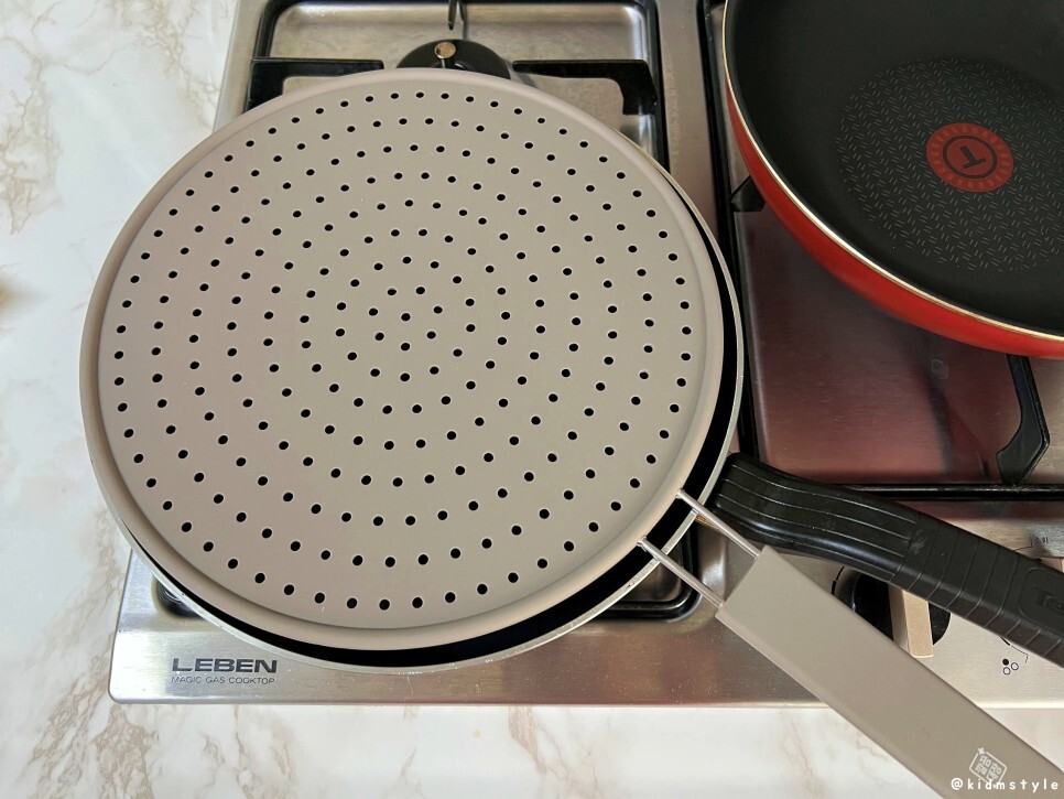 튀는 기름은 막아주고 수증기는 배출하는 제품이다. 사용방법은 간단하다. 후라이팬 등 뚜껑이 필요한 곳에 올리고 쓰면 된다. 튀김용, 구이용, 국물 조리 시 사용하면 된다.