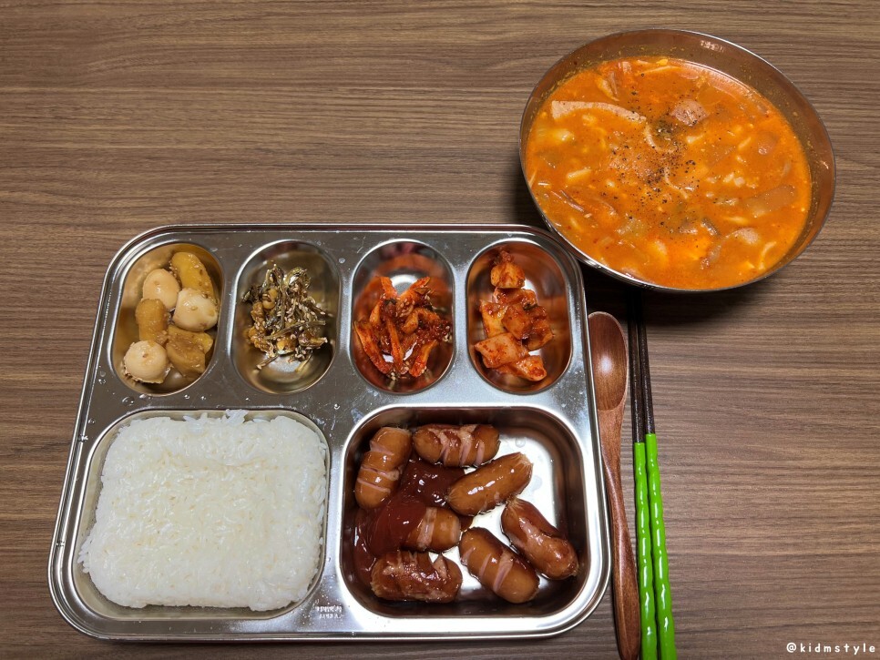 열심히 구운 소시지와 한상을 차려보았다. 집밥 클라쓰. 찌개는 땅스부대찌개인데 너무 많이 담아서 남겼다. 이 사진을 찍었던 게 2월 초인데 요즘은 저렇게 많이 안 먹는다. 보기만 해도 군침 돈다. 맛있는 집밥.