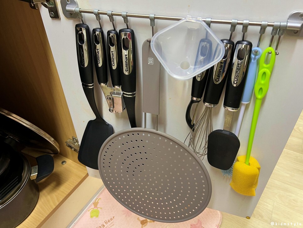 싱크대 문 안쪽에 이렇게 걸어두니 딱이다. 다행히 딱 맞게 문이 닫힌다.