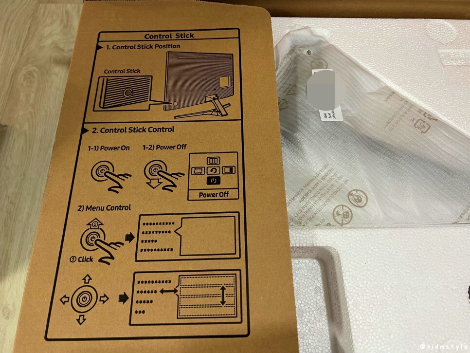 상자를 열다 보니 간단하게 사용법이 그려져 있다. 이 제품은 모니터 후면에 동그란 컨트롤 스틱 control stick이라는 버튼을 이용해서 전원, 메뉴 컨트롤이 가능하다.