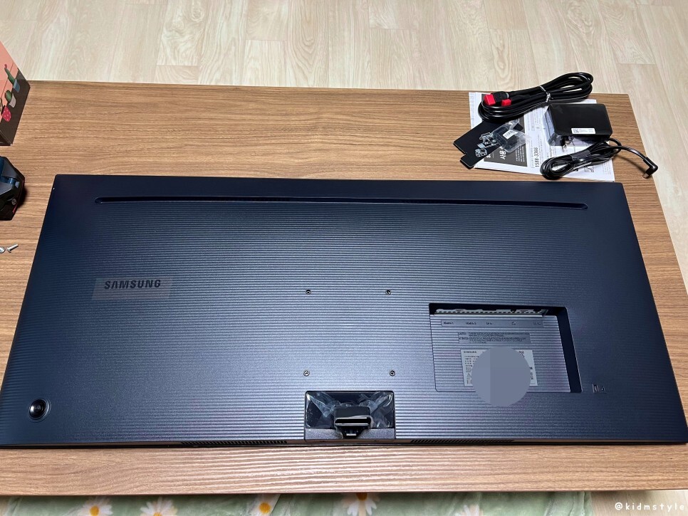상자에서 모니터와 구성품을 꺼내서 테이블에 올렸는데 테이블이 꽉 찬다. 모니터의 뒤면은 깔끔한 편이다.