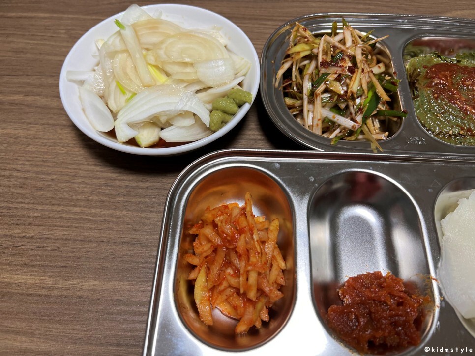 양파를 썰고 참소스를 붓고 와사비 좀 짜주면 고깃집 그 맛이 된다. 집에서 고기 먹을 때 참소스는 진짜 필수이다. 대충 만든 무생채도 입맛에 맞다.