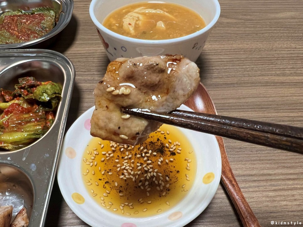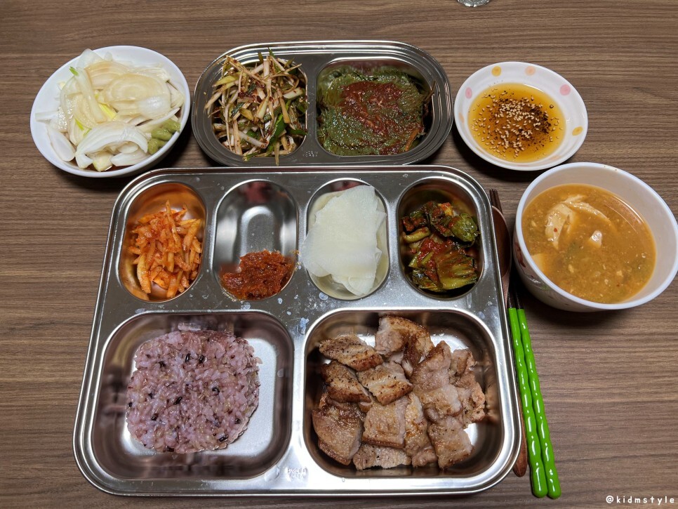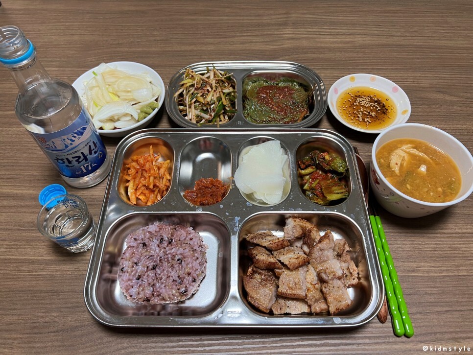 오늘 구운 삼겹살 괜찮네. 질기지도 않고 퍽퍽하지도 않고 딱 내가 원하는 삼겹살의 식감을 잘 보여준다. 오래간만에 집에서 혼술을 위해 차려본 삼겹살 홈 파티는 대성공이었다.