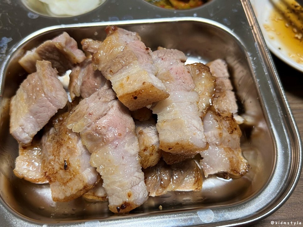잘 구운 삼겹살 한 점 집어 들고 참기름 소금장에 푹 찍어 먹어본다. 삼겹살은 언제 먹어도 맛있다.