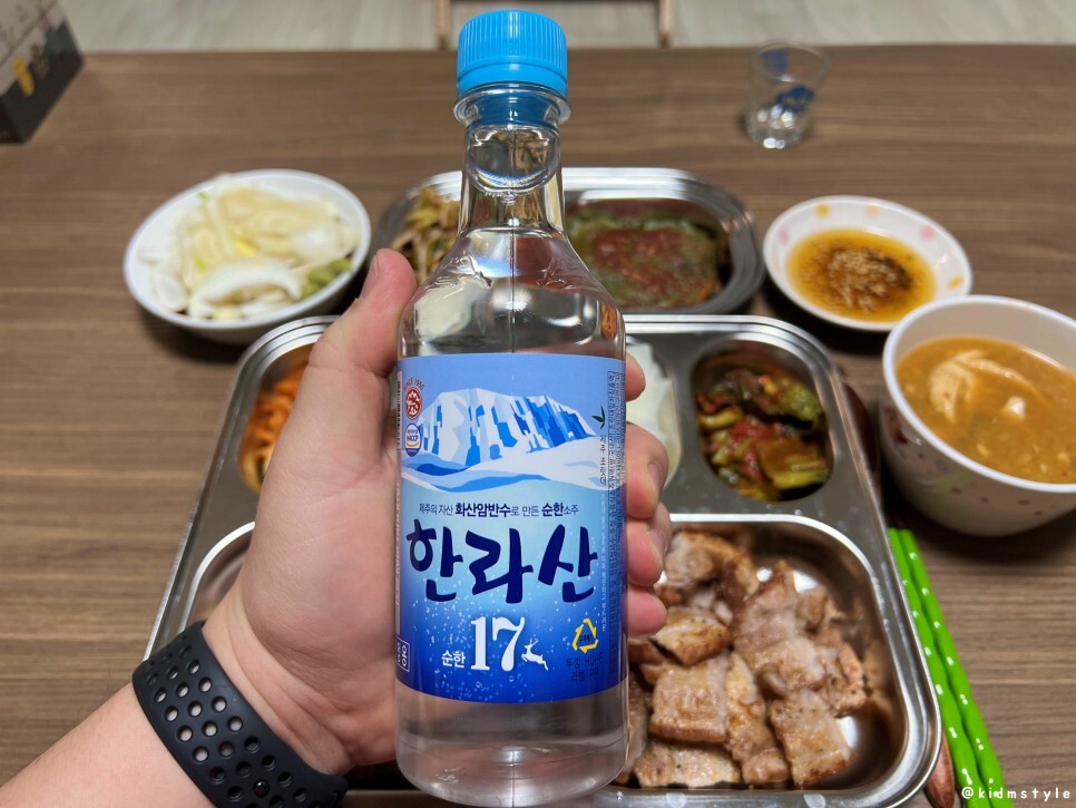 부산사람 부산소주 대선을 마셔야 하는데 오늘은 제주도에 가고 싶은 마음을 담아서 한라산 17도를 맛보자. 이 술은 깔끔하면서 소주라는 느낌을 잘 보여주기에 내가 참 좋아하는 스타일이다.