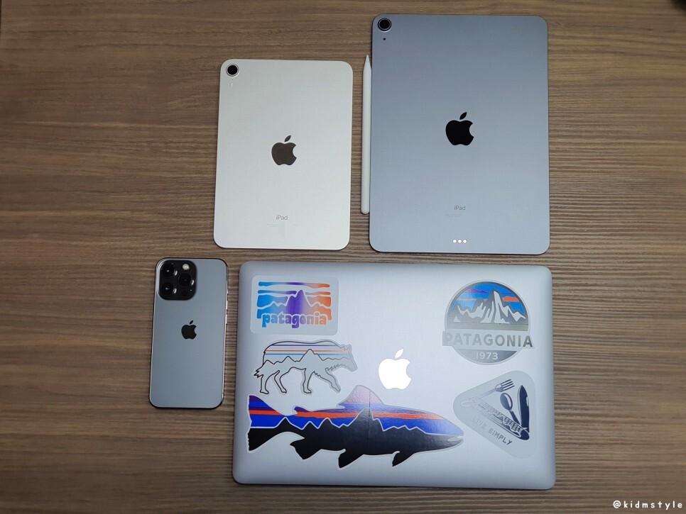 아이폰 13프로, m1 맥북프로, 아이패드 에어 4세대, 아이패드 미니 6세대 등 가지고 있는 애플 제품을 찍어본다. 에어팟 프로는 깜빡했다.