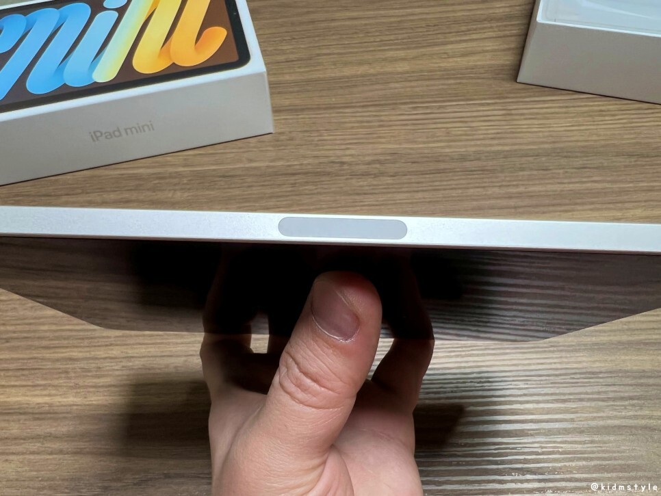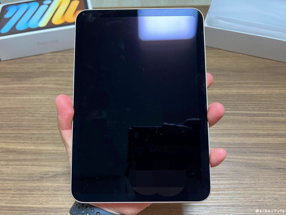 한 손에 딱 쥐어진다. 이래서 아이패드 미니 6세대가 인기가 많다. 이전까지 5세대와는 다르게 홈버튼이 사라져서 훨씬 낫다. 이리저리 만지느라 지문이 묻었다.