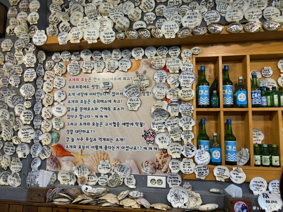 벽에 가리비 껍데기에 이리저리 메시지를 적어서 걸어놨다. 구경만.