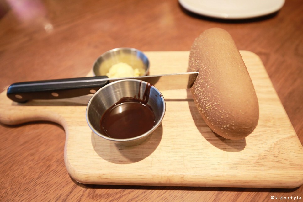아웃백 하면 떠오르는 것 중 하나가 식전 빵, 부시먼 브레드이다. 기본으로 망고 버터가 나오는데 추가로 초코 소스, 블루치즈 등을 요청할 수 있으며 초코 소스를 요청해서 받았다.