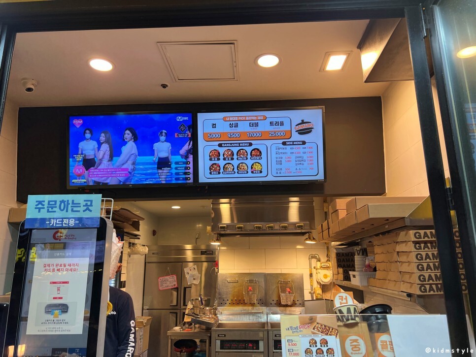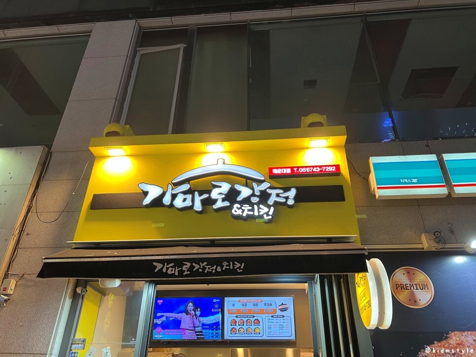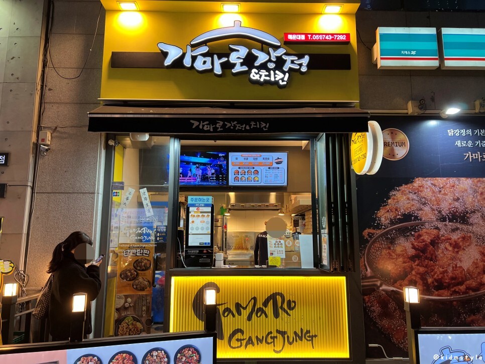 해운대시장 쪽으로 한 바퀴 둘러보았는데 딱히 땡기는 게 없더라. 상국이네 같은 분식도 비싸기만 하고. 다시 숙소 부근으로 와보니 가마로닭강정이 보인다. 가마로강정&치킨이 정식 명칭이네. 우스운 건 2차로 먹었던 긴타로 바로 옆이라는 점이다. 돌고 돌아 제자리.