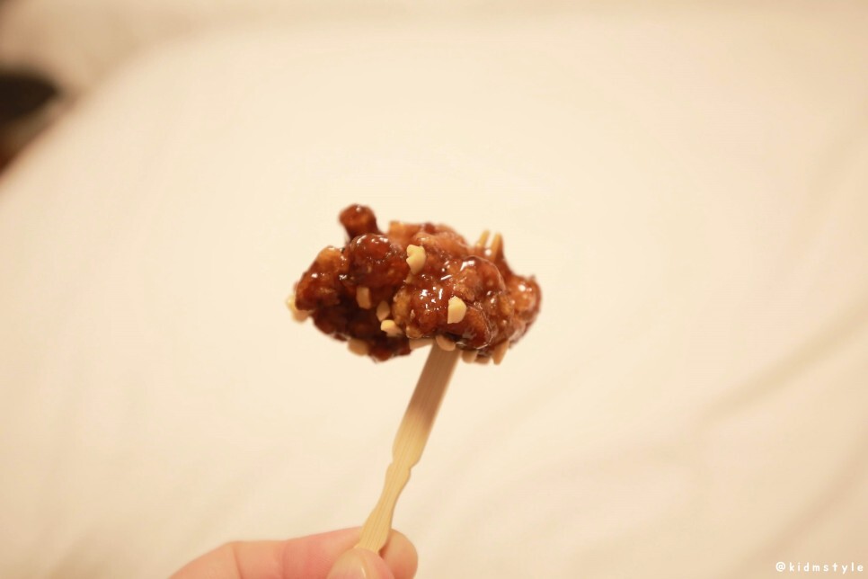 작고 귀여운 나무 포크로 강정을 찍어서 맛본다.
