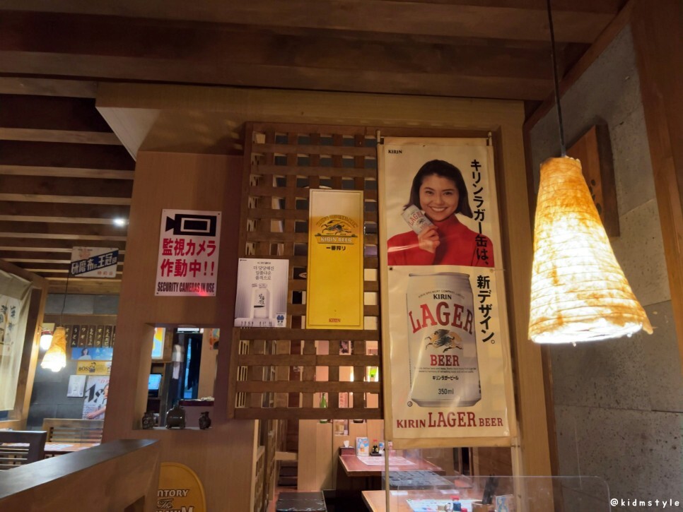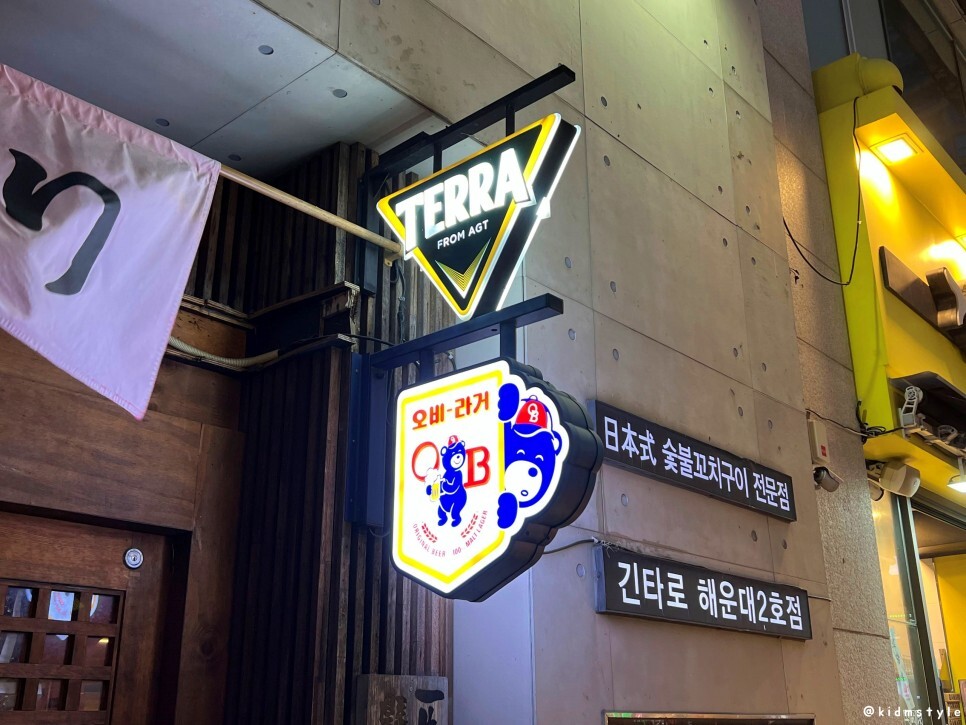 테라, 오비라거 생맥주를 취급하는 모양이다. 일본식 숯불꼬치구이 전문점 긴타로.
