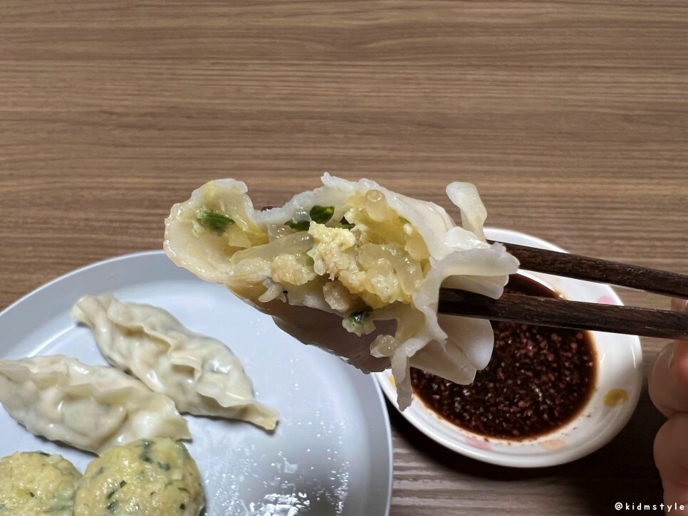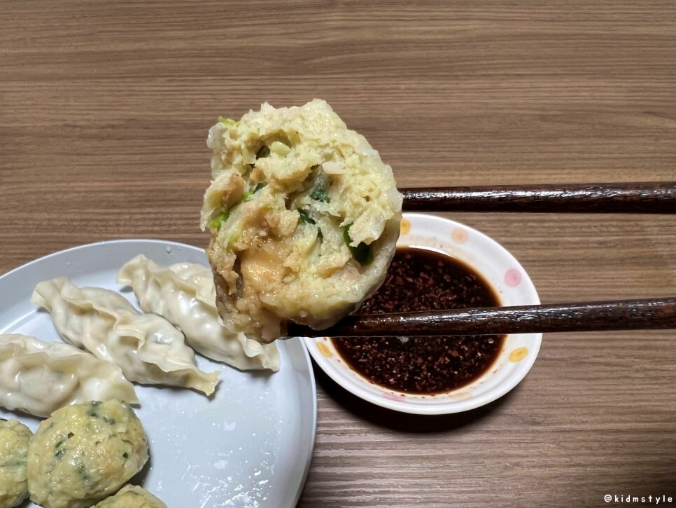 소스를 찍었다. 한입 맛보니 너무 맛있는데? 만두피가 거의 없으니 내용물이 그대로 치고 들어온다. 와, 이거 놀랍다.