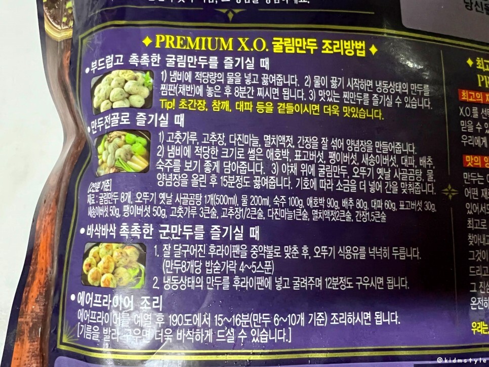 오뚜기 x.o. 교자 고기&제주마늘, x.o. 굴림만두 김치, x.o. 굴림만두 고기 이렇게 3가지 종류이다. 결론부터 말하면 x.o. 만두는 교자보다 굴림만두가 정말 맛있다. 참고하기 바란다.