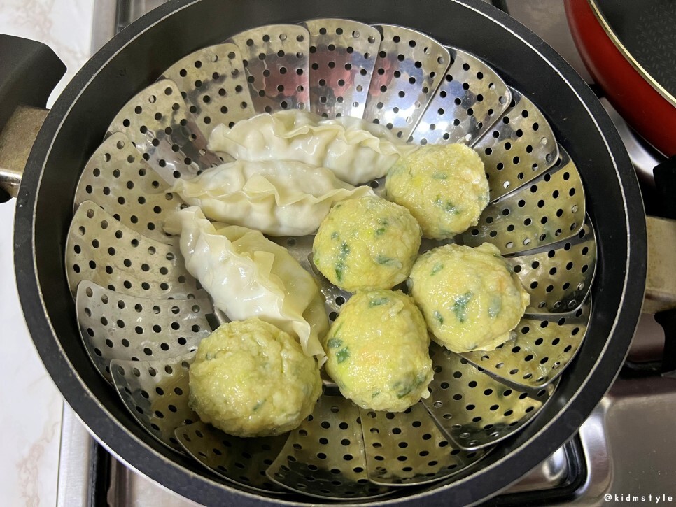 집에 찜기가 없다. 그래서 커다란 냄비에 꽃 찜기를 깔고 쪄본다. 예전에 라붕님이 추천해 주신 찜기 사볼까 생각 중이다. 냉동실에 놀고 있던 비비고 왕교자 3개와 굴림만두 5개를 쪄보자. 물이 끓어서 만두를 넣어본다.