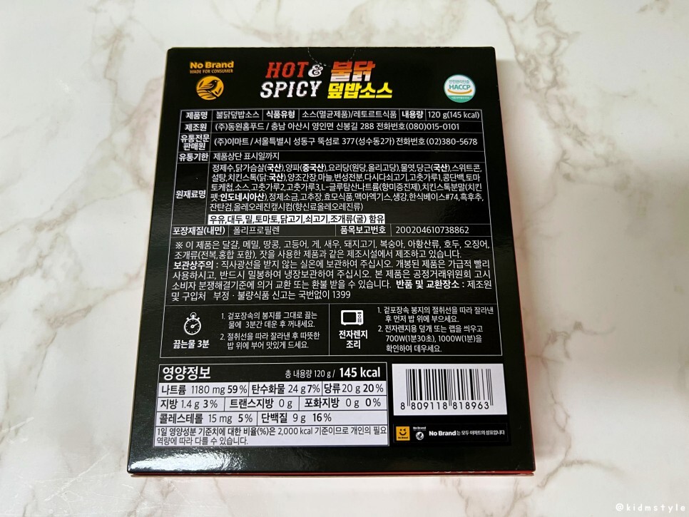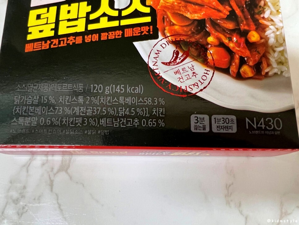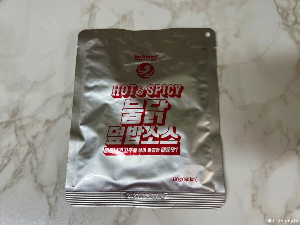 노브랜드 hot & spicy 불닭 덮밥소스다. 베트남 건고추를 넣어 깔끔한 매운맛을 제공해 준다고 한다. 가격은 1,280원으로 저렴한 편이다.