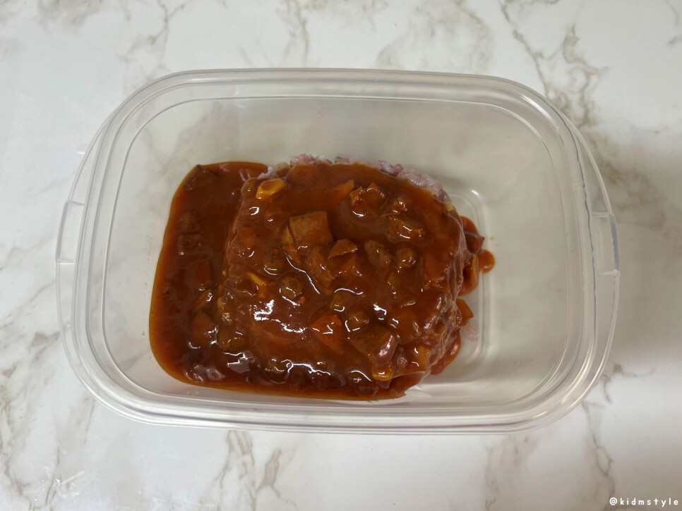 전자레인지에 돌리기 위해 냉동 소분했던 밥을 넣고 소스를 부어준다.
