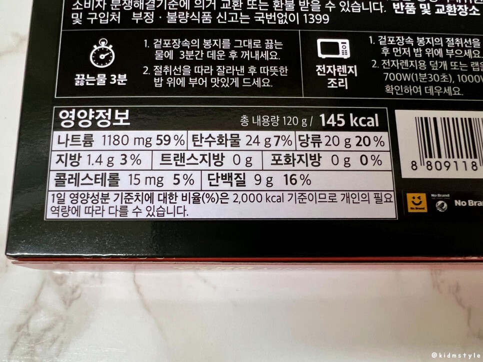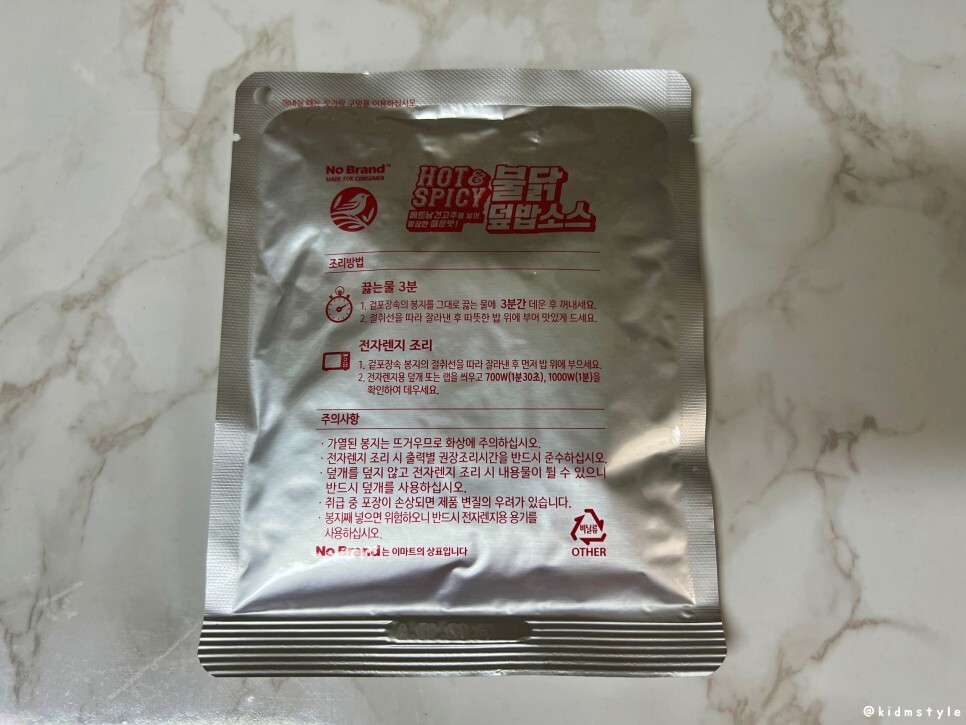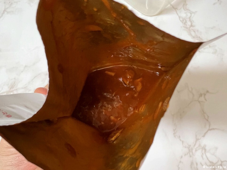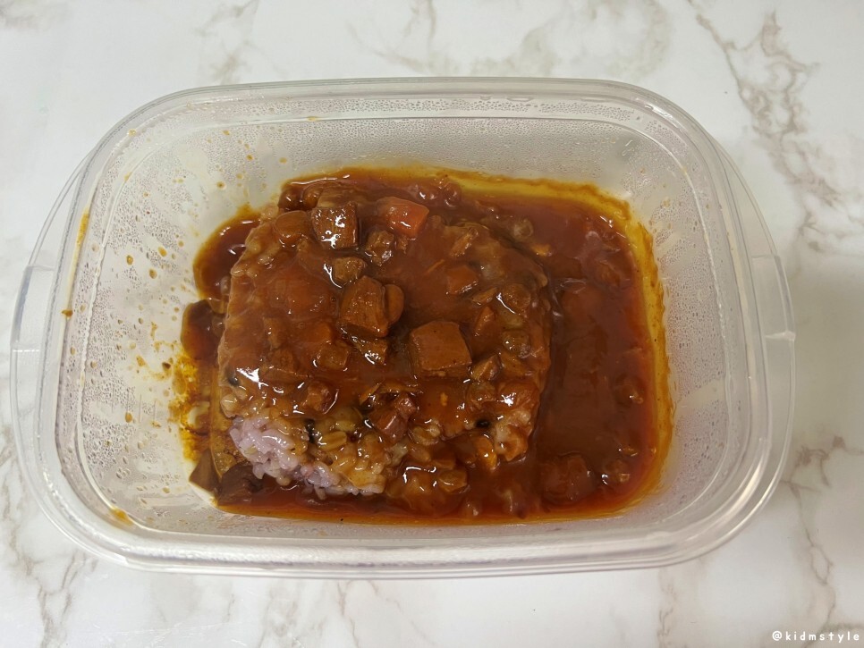 조리법은 간편하다. 3분 카레처럼 끓는 물에 3분 끓여도 되고 더 간편하게 전자레인지 (700w 기준)에 1분 30초간 돌리면 된다.