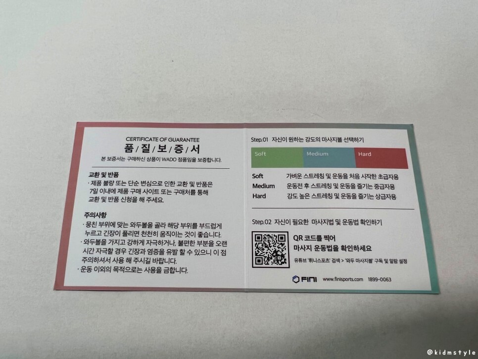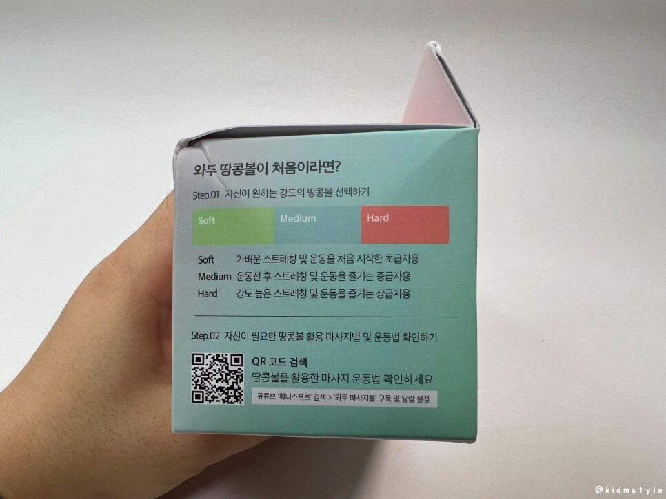 설명이 되어 있는데, 특이하게 3가지 강도의 제품을 판매한다. 내가 받은 제품은 hard 강도 높은 스트레칭 및 운동을 즐기는 상급자용이다. 이미 마사지볼을 수년간 사용해왔기에 괜찮다. 소프트, 미디엄, 하드 순으로 강도가 단단해진다.