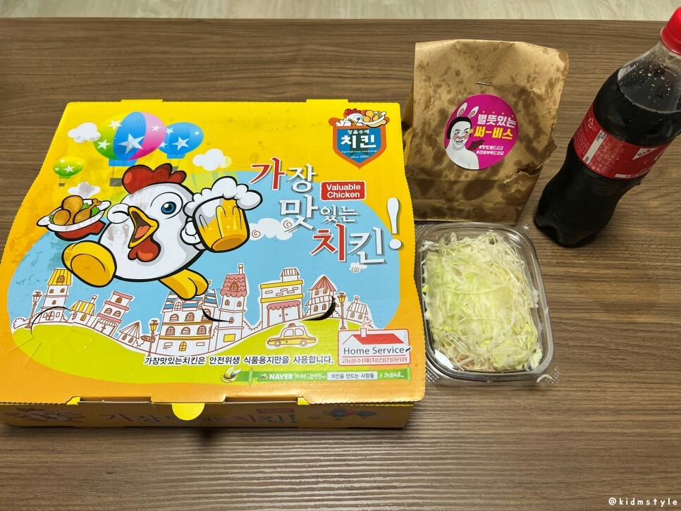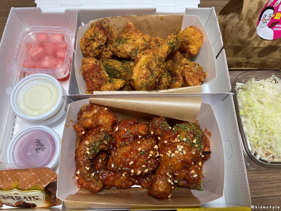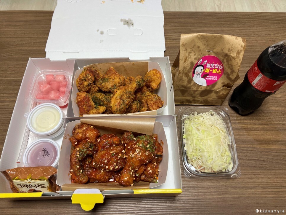 닭썸은 다양한 메뉴가 있는데 나는 가장 기본적인 뼈 있는 양념, 후라이드 반반으로 주문을 했다. 양배추 샐러드도 보내주니 참 좋다. 배달 주문을 하면 초코파이나 크라운산도 같은 과자도 하나씩 넣어서 보내준다.
