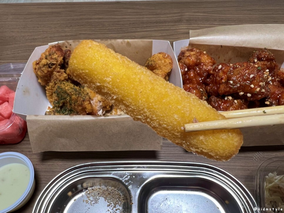 리뷰 이벤트로 받은 치즈스틱과 감자튀김이다. 치킨과 잘 어울리는 안주이다. 거리가 가까운 편이라 그런지 치킨과 감튀가 따뜻하다.