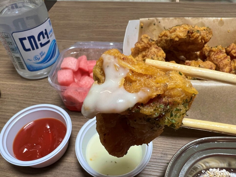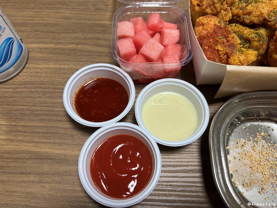 후라이드를 연유 소스에 찍어서 맛보니 달달한 게 참 맛있다.