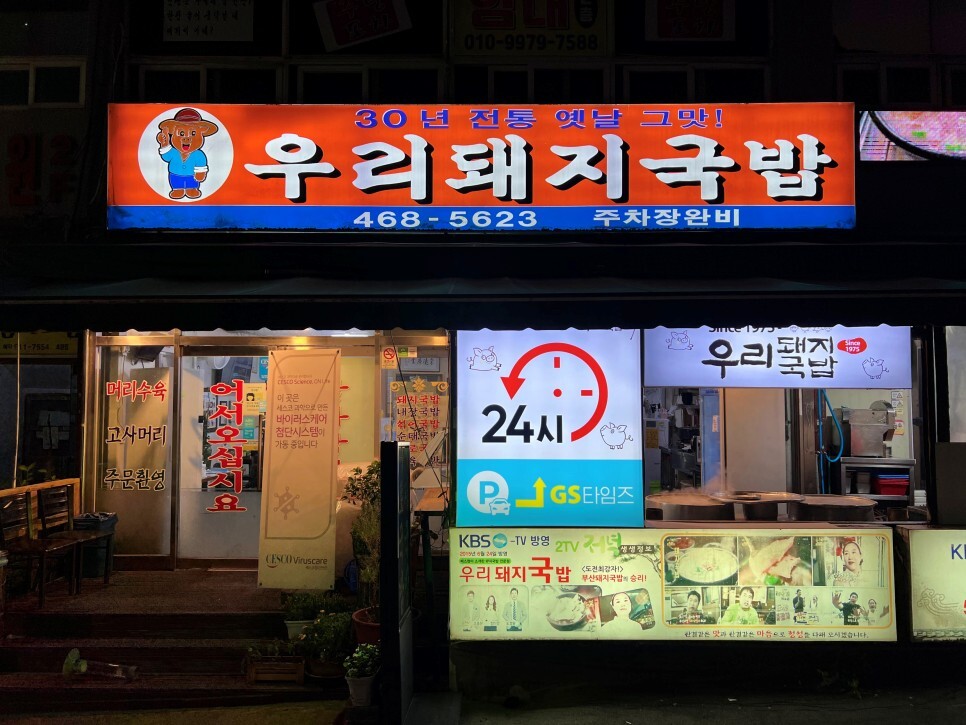 늦은 밤 출출하네요. 오래간만에 야식을 맛보기 위해 찾아가 보았습니다. 동네에 사는 친구에게 연락해서 함께 밥을 먹기로 합니다. 이곳은 24시간 영업을 하는 곳입니다. 그래서 밤낮으로 손님이 많이 찾는 돼지국밥집이에요.