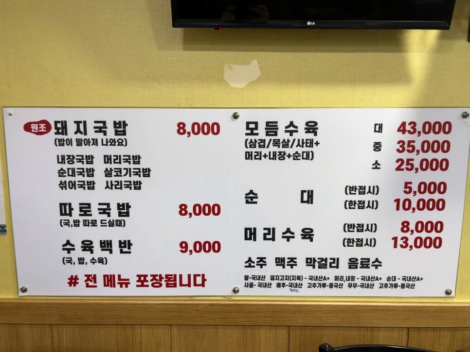 메뉴판을 찍어봅니다. 이날은 돼지국밥을 주문해 보았습니다. 참고로 수육도 괜찮고 순대도 맛있어요. 밥이 말아져 나오는 국밥과 따로국밥의 가격이 동일한 점도 장점입니다. 취향껏 주문해서 드시면 될 것 같아요.