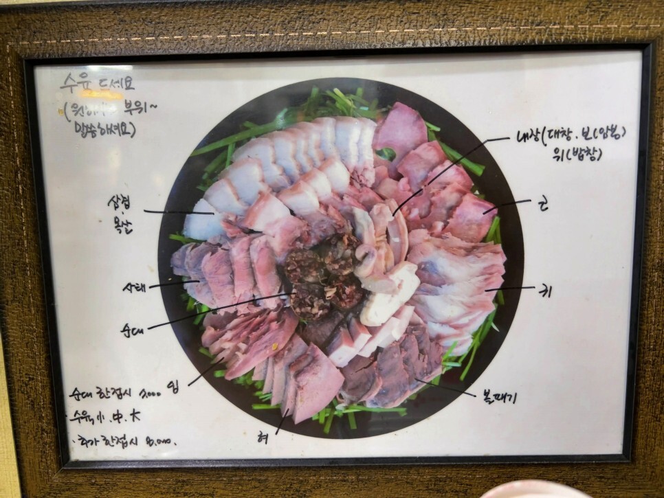 모둠 수육의 구성인데요. 다양한 부위를 제공해 주기 때문에 수육을 좋아하는 분들은 모둠 수육을 놓고 소주잔을 기울이기 참 좋아 보입니다.