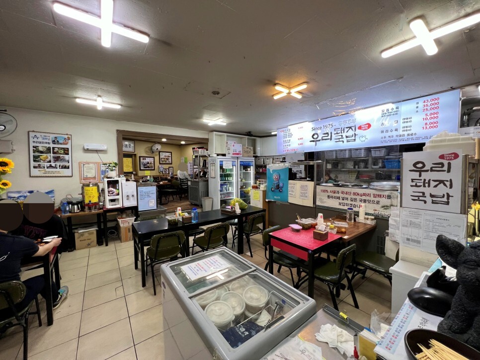 실내는 이런 모습입니다. 안쪽에도 좌석이 있고 안쪽 오른쪽에도 또 공간이 있어요. 꽤 좌석이 많아요. 점심, 저녁시간에는 늘 손님들로 북적입니다. 입구부터 홀 내부에 은은하게 퍼져있는 돼지 냄새가 돼지국밥집임을 알려줍니다.