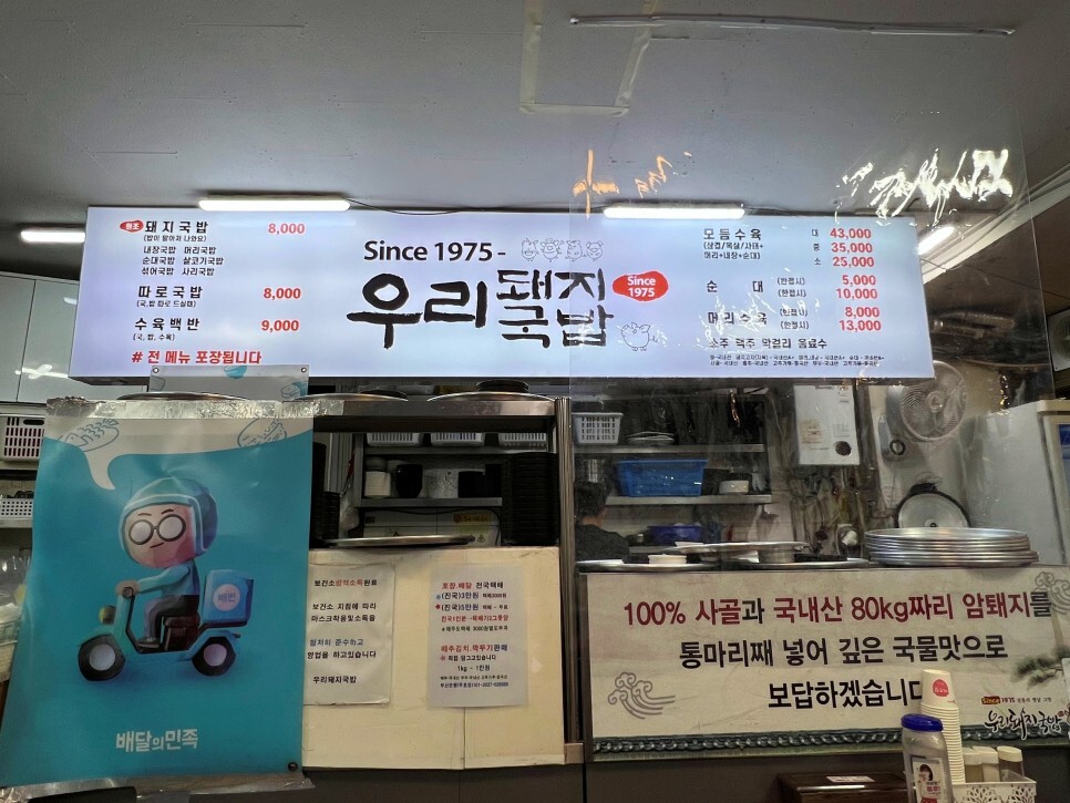돼지사골과 국내산 80kg급 암퇘지를 통마리째 넣어서 국물을 우려냅니다. 우리돼지국밥은 1975년에 시작하여 현재 3대에 걸쳐 영업 중입니다. 예전에는 초량육거리에 돼지국밥집이 많았는데 이제는 우리돼지국밥과 할매돼지국밥이 그 명맥을 유지하고 있네요.