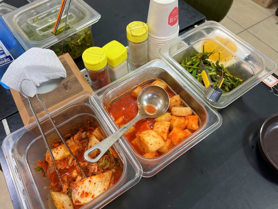 김치와 깍두기, 부추무침 등이 테이블마다 놓여있습니다. 뚜껑을 열고 찍어보았습니다. 접시에 먹을 만큼 덜어먹으면 됩니다.
