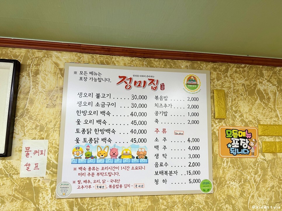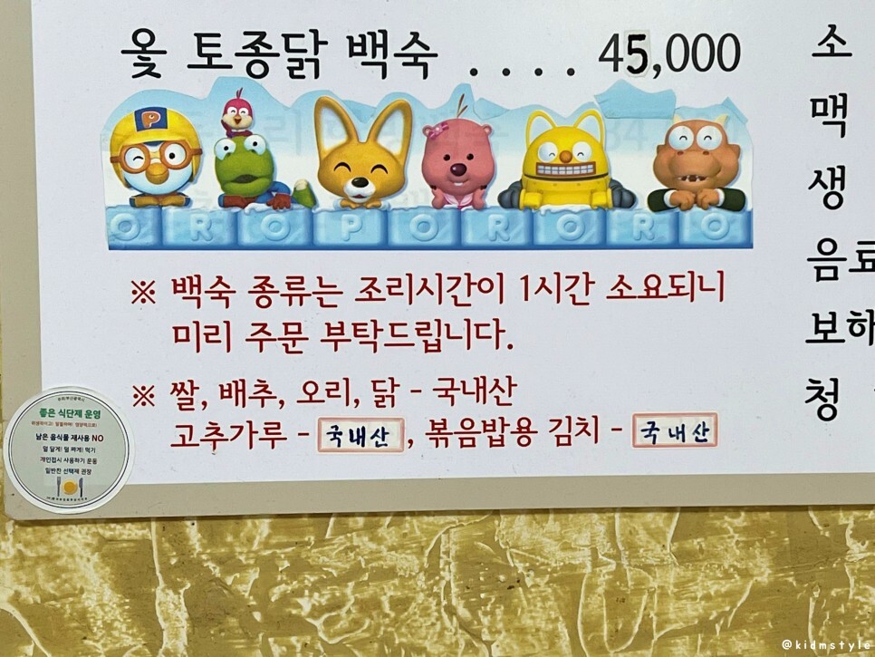 백숙 종류는 압력솥으로 조리하며 조리시간이 1시간 걸리기 때문에 미리 주문하면 된다. 백숙도 괜찮다. 백숙에 버섯이 꽃처럼 올라가는 게 특징이다. 일명 꽃송이버섯. 그리고 모든 재료가 국산이다. 요즘 이런 곳 잘 없다.