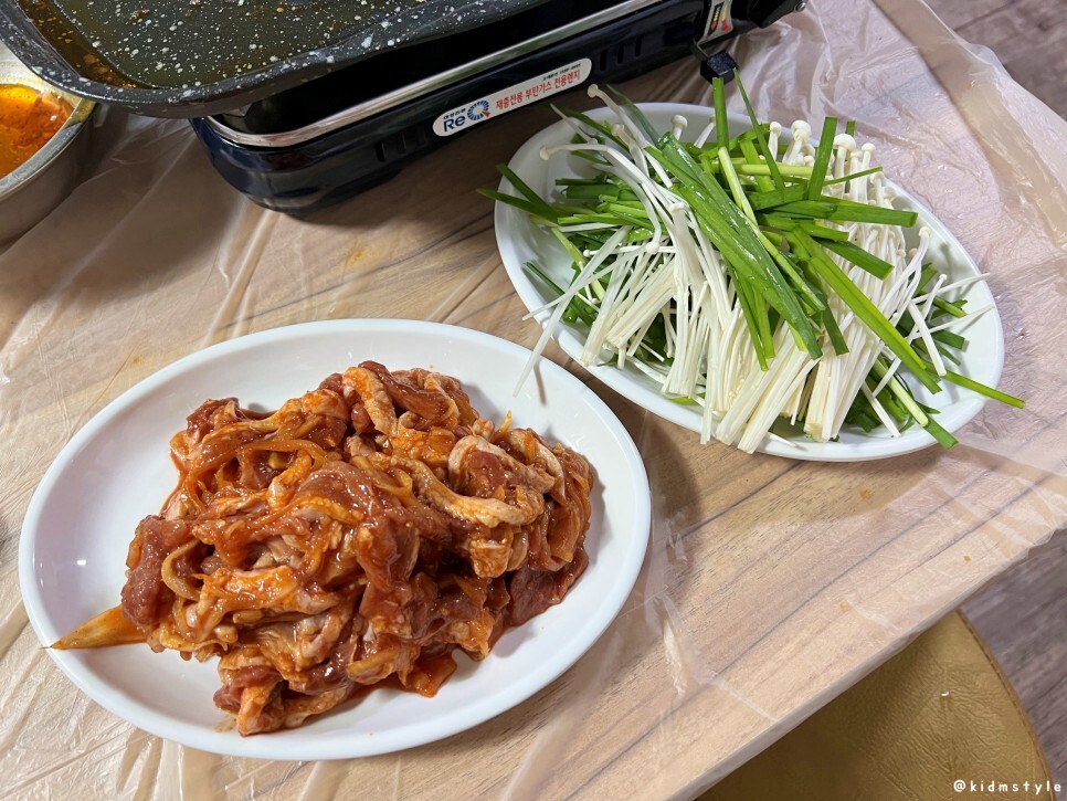 안 매운 모닝 고추는 먹기 좋게 잘라놨고 그 옆에는 정말 매운 땡초, 그리고 마을은 이미 불판 위에서 굽고 있다.