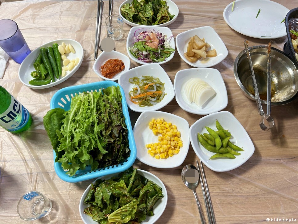 샐러드, 양파지, 곤약면, 쌈무, 콘샐러드, 완두콩 등 반찬이다. 고기를 굽는 동안 소주 한잔하기 좋은 반찬들이다.