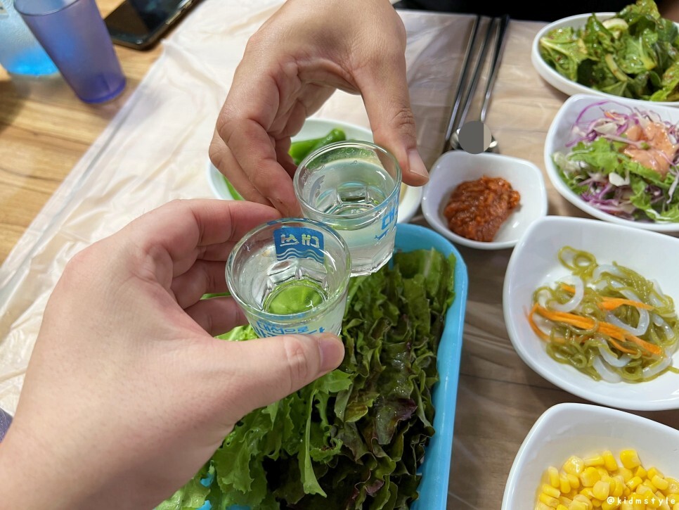 상추에 깻잎, 치커리, 쌈무 깔고 재래기 올리고 고기 올리고 한 쌈 딱 먹으니 꿀맛이다. 그렇게 흡입 또 흡입, 소주도 흡입.