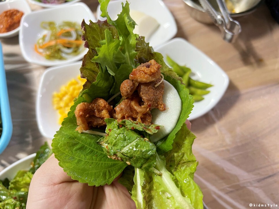채소가 금값인데 인심이 넘친다. 깻잎, 상추, 치커리 등 신선한 쌈 채소가 한가득 나온다. 치커리 좋아하는데 오래간만이다.