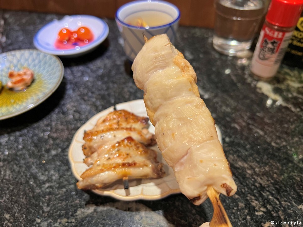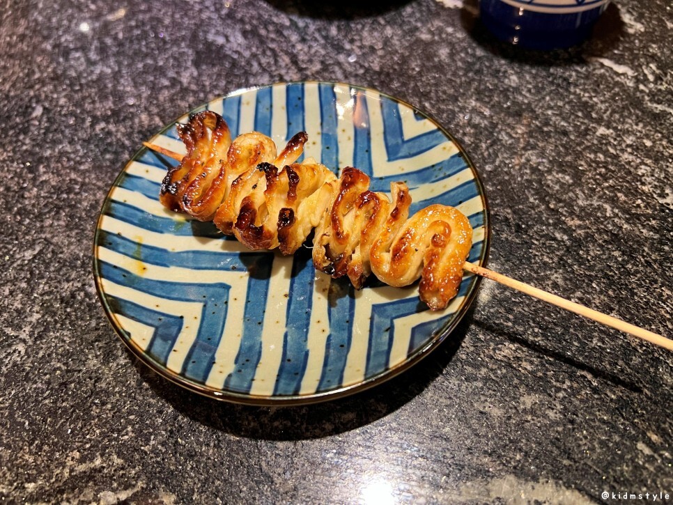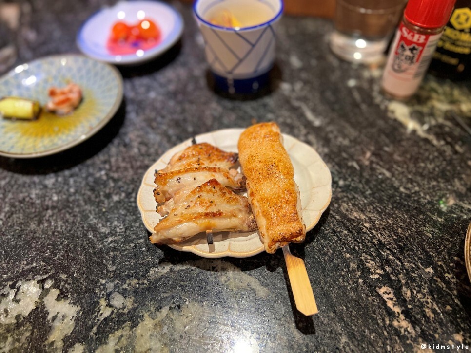 닭껍질 꼬치가 나왔다. 닭껍질 역시 맛있다. 적당히 잘 구워서 너무 바삭하지 않아서 좋더라.
