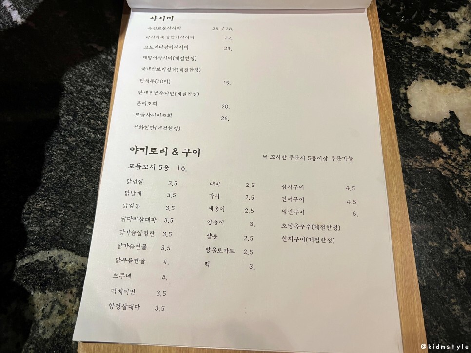 무엇을 먹을지 고민하다가 모둠꼬치 5종 (16,000원)을 주문해 보기로 했다. 꼬치를 고를 수 있는데 4,000원 이상의 꼬치는 5종에 포함이 되는지는 모르겠다.
