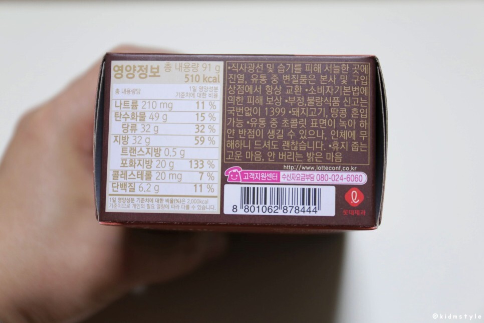 총중량은 91g, 510kcal이며 코코아 매스 6.7%, 코코아 분말 1.6%가 주 구성 성분이다.